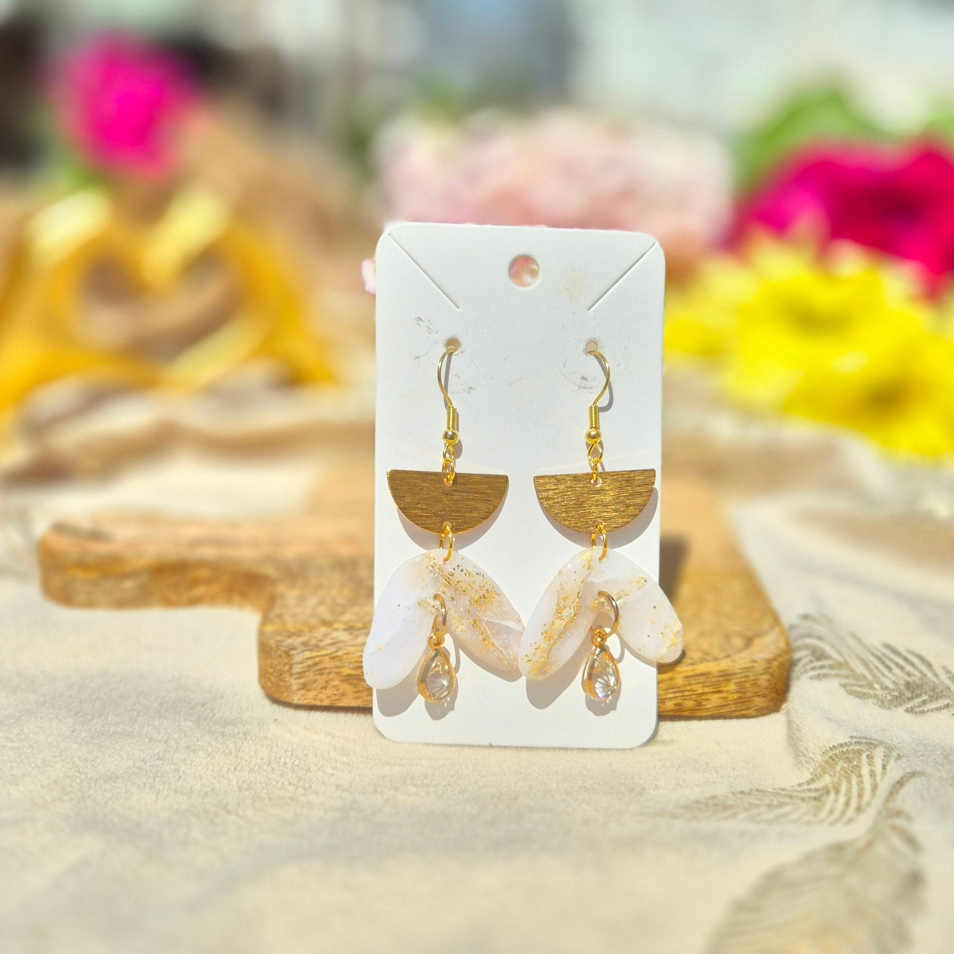 Douceur céleste et éclat discret, ces boucles d'oreilles artisanales en pâte polymère translucide avec des touches de dorées révéleront votre style élégant et raffiné.
