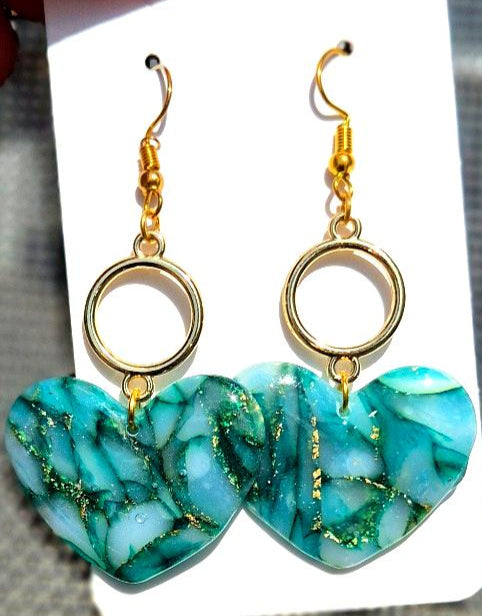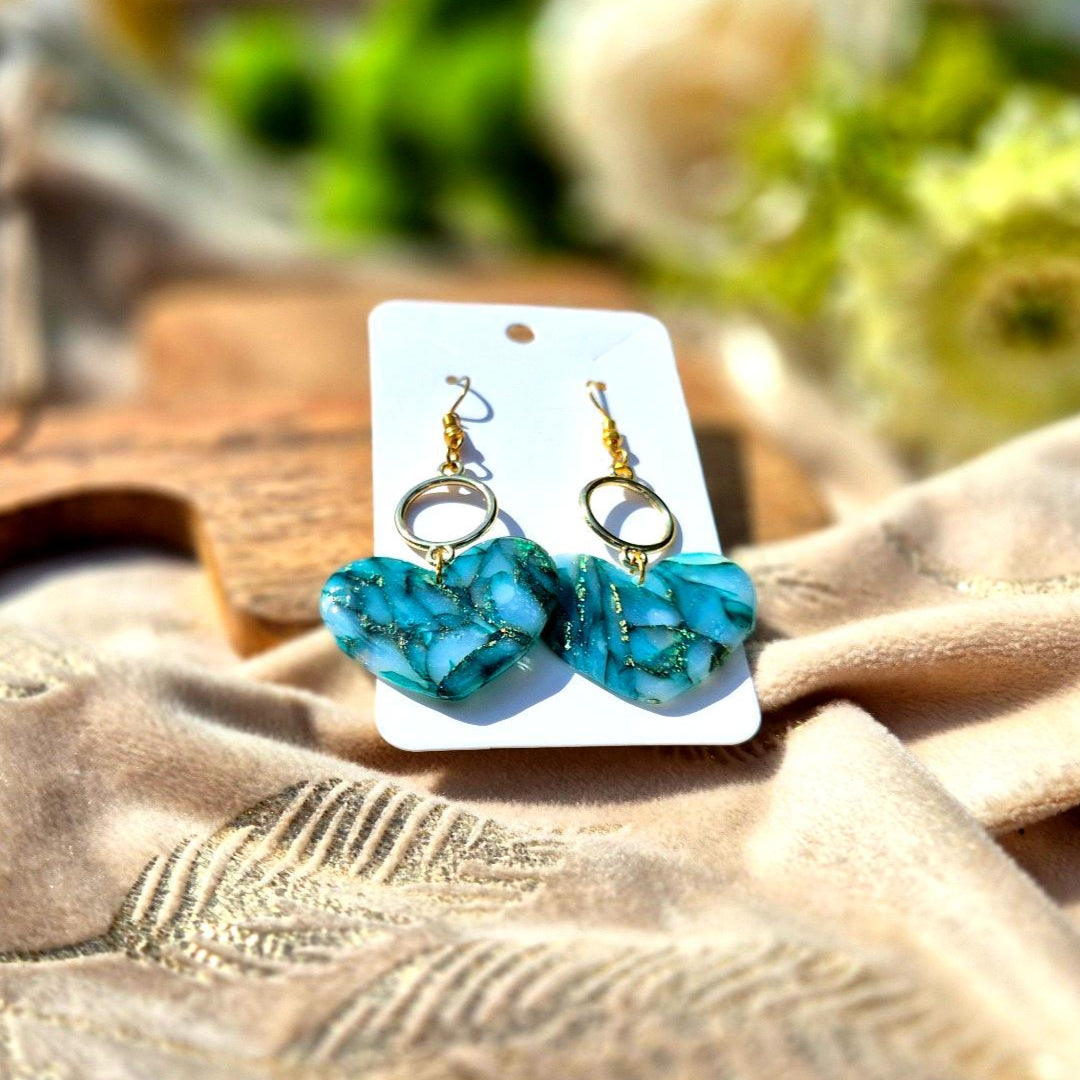 Cœur de Jade associe un cœur vert émeraude marbré d’or à une monture dorée, pour un bijou artisanal frais et lumineux.