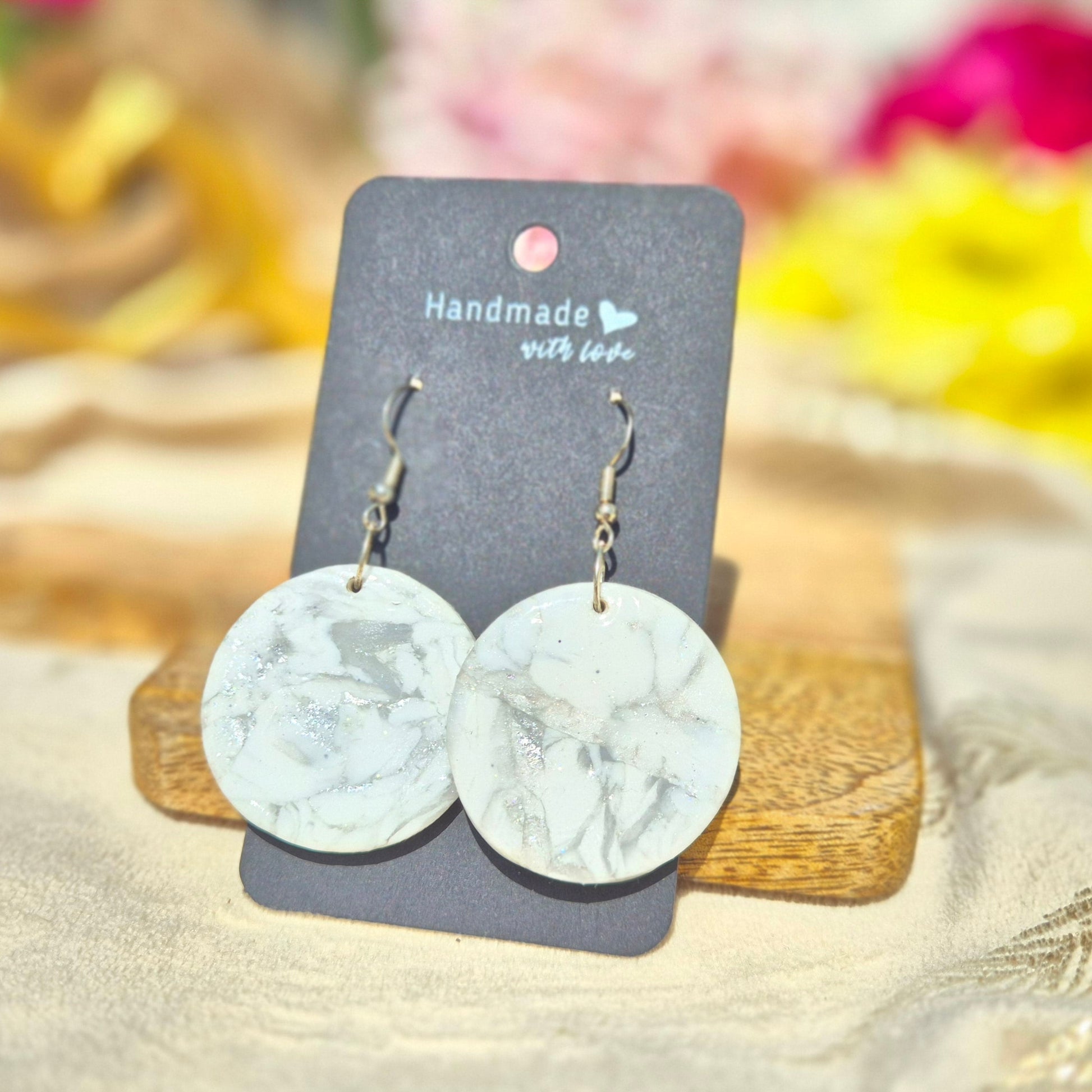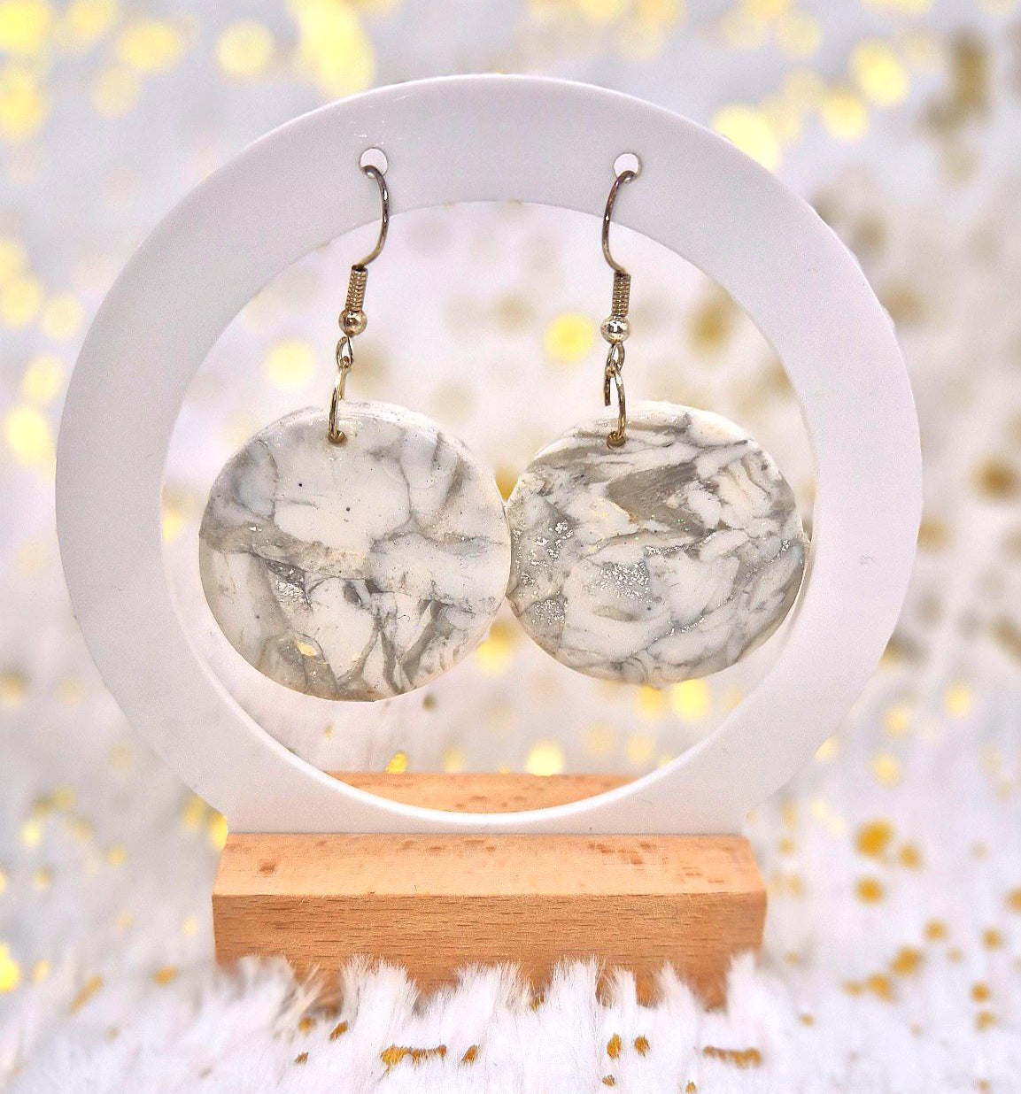 Éclat de Marbre sublime un disque marbré gris et ivoire rehaussé de particules argentées pour un bijou rond, brillant et résolument moderne.