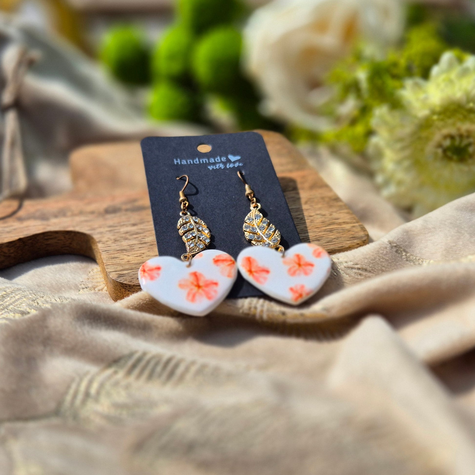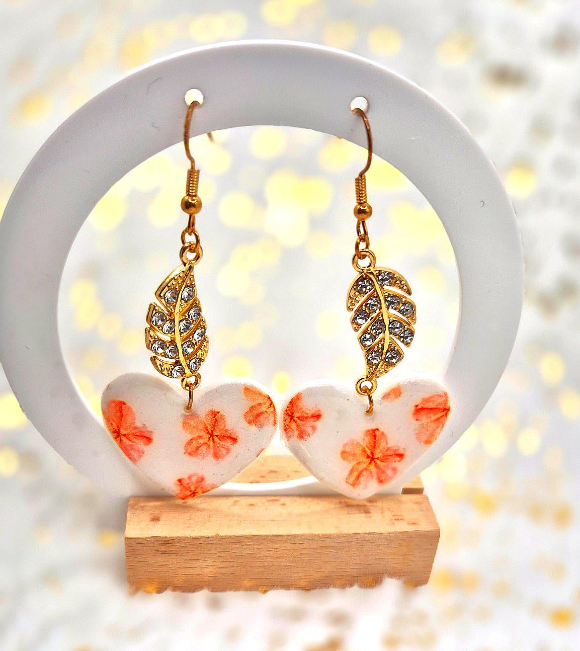 Éclosion d’Amour révèle un cœur délicatement orné de pétales corail sur fond ivoire, sublimé par une feuille dorée sertie de cristaux pour un bijou frais et raffiné.