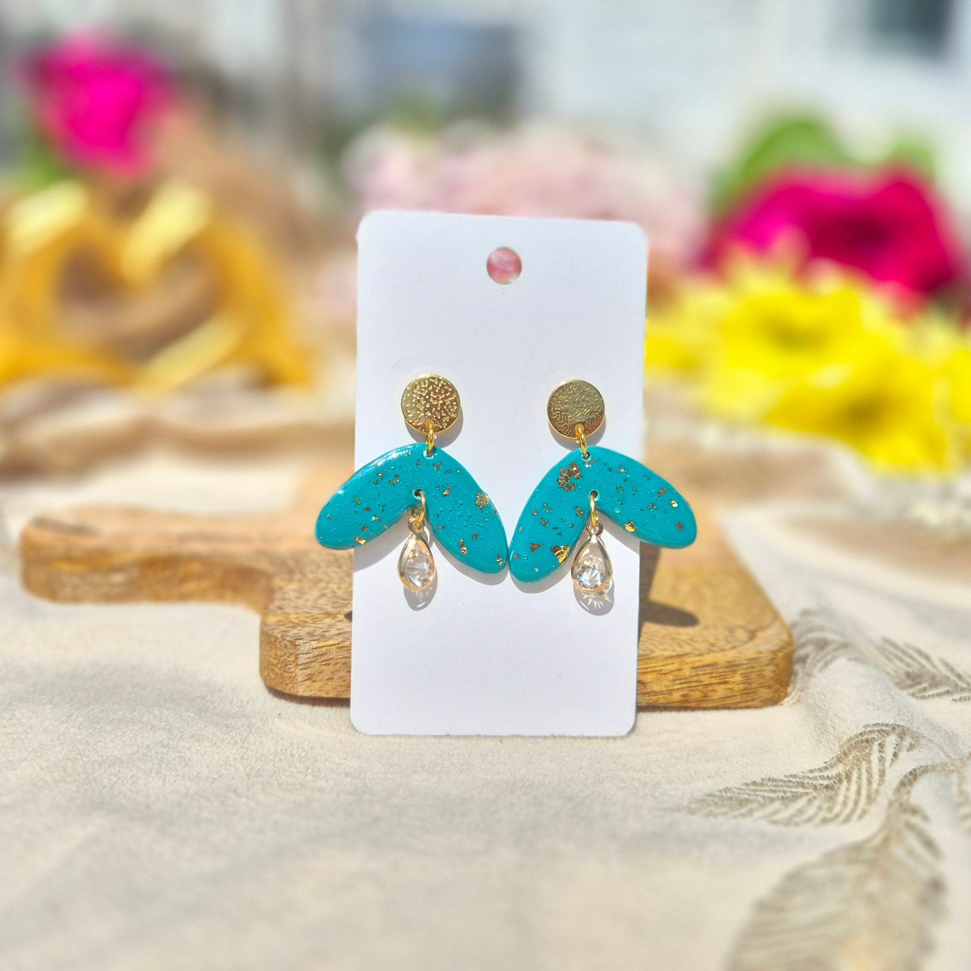 Ces boucles d'oreilles artisanales en pâte polymère aux éclats dorés ajoutent de la lumière à ce vert profond, soulignées par une perle translucide révélant votre style sophistiqué et audacieux.