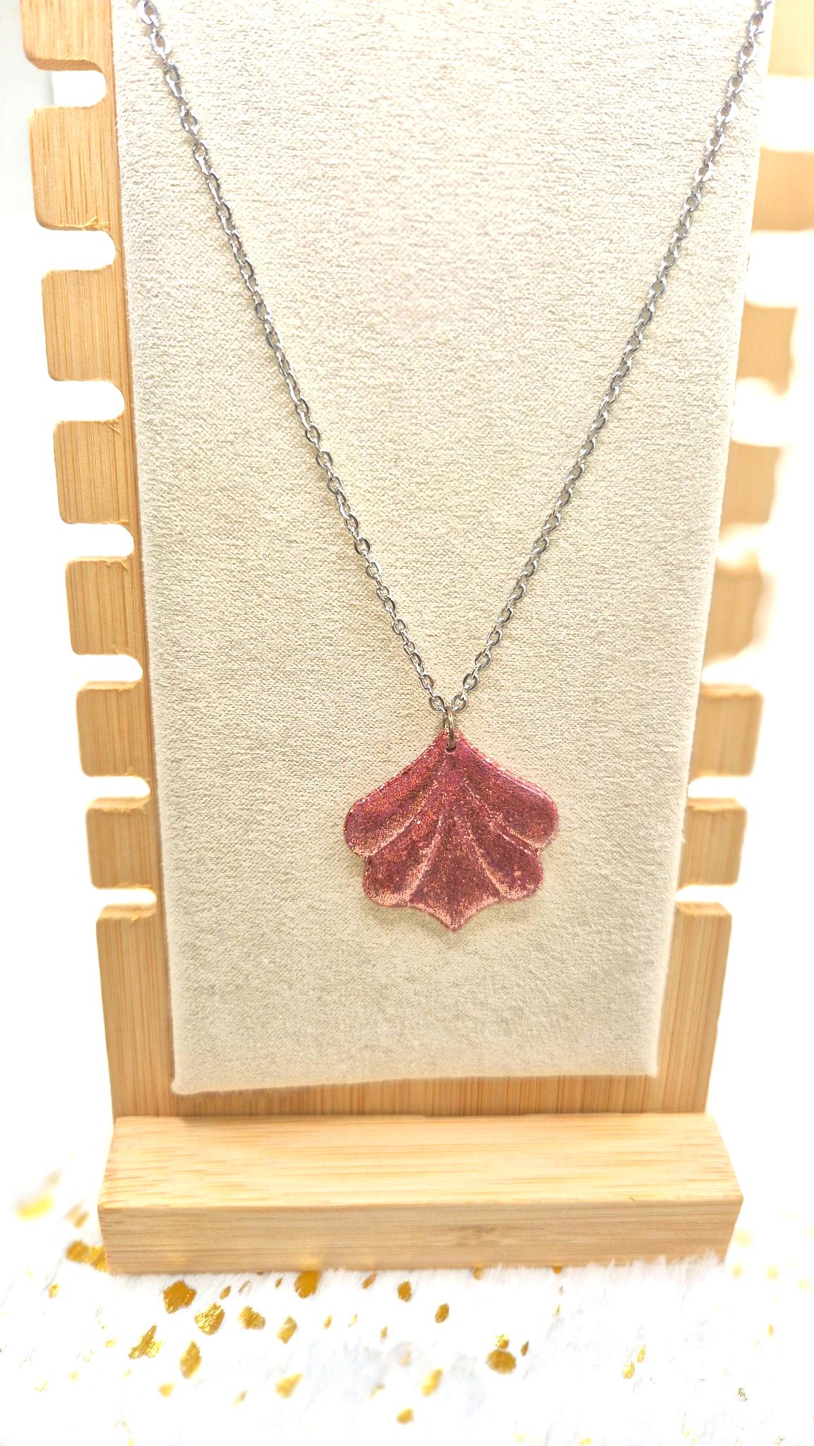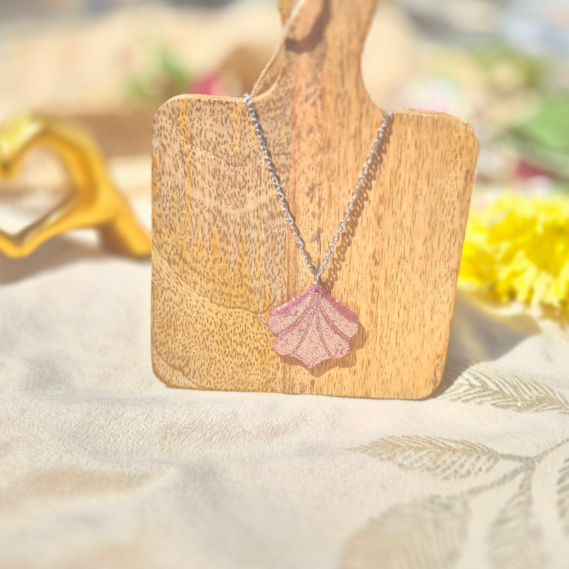 Son pendentif rose pailleté, inspiré d’un pétale stylisé, capte la lumière et sublime chaque décolleté avec poésie.