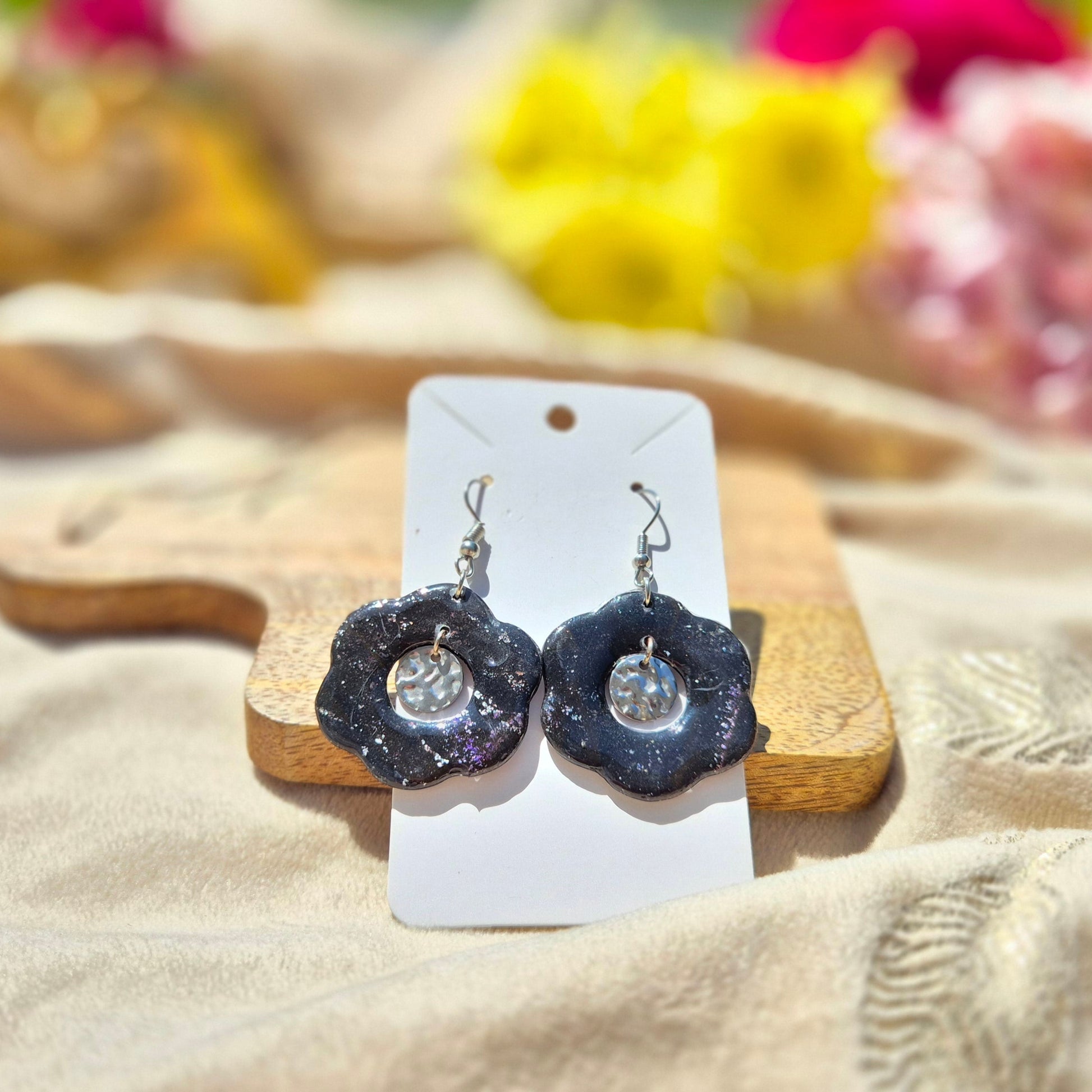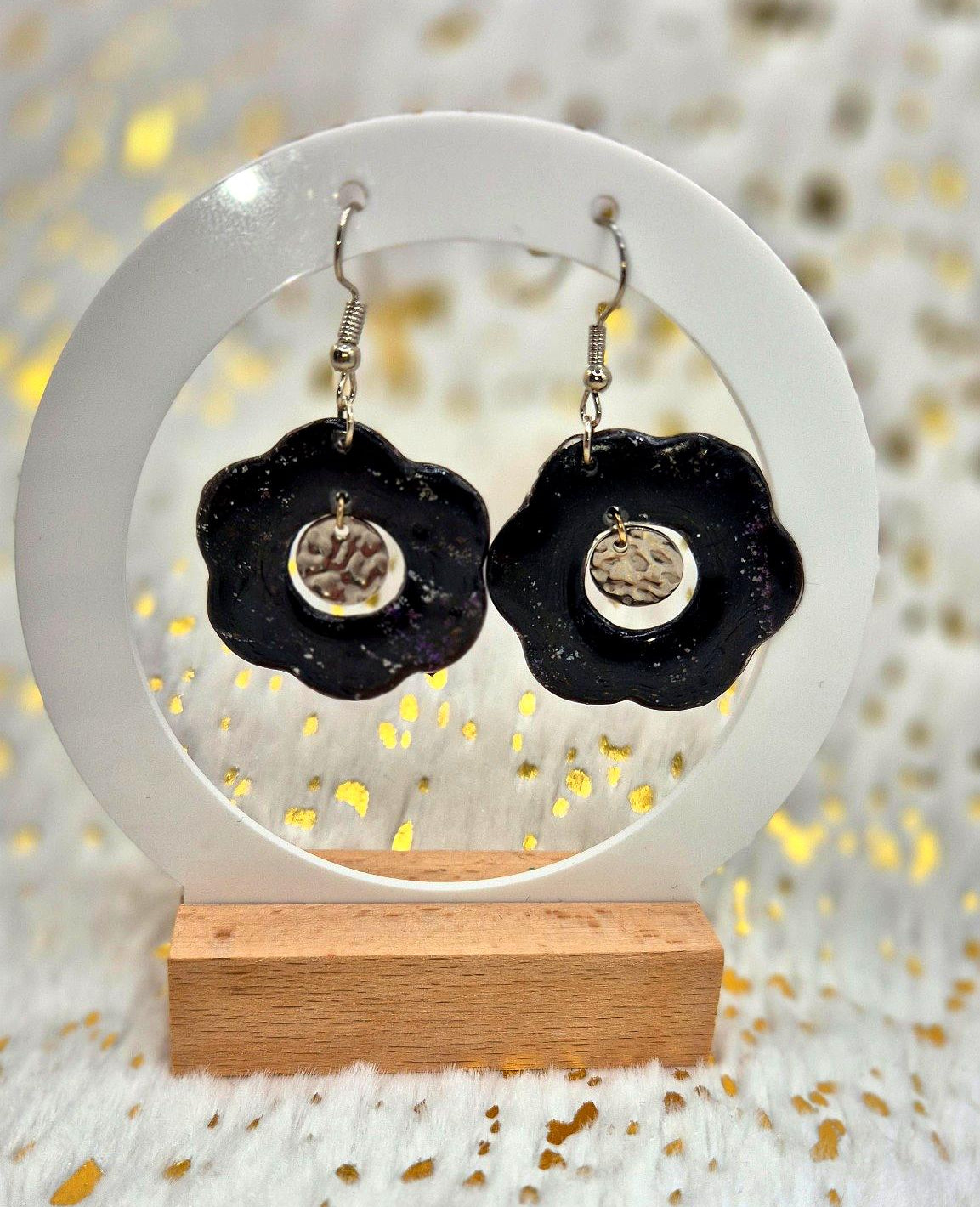 Un contraste entre mystère et éclat : Éclipse Florale, une création audacieuse où le noir profond se mêle à la délicatesse d’une fleur stylisée. Le rond martelé en argent vient sublimer l’ensemble, tel un reflet de lune suspendu. Une pièce élégante et magnétique, idéale pour celles qui aiment les bijoux affirmés et singuliers.