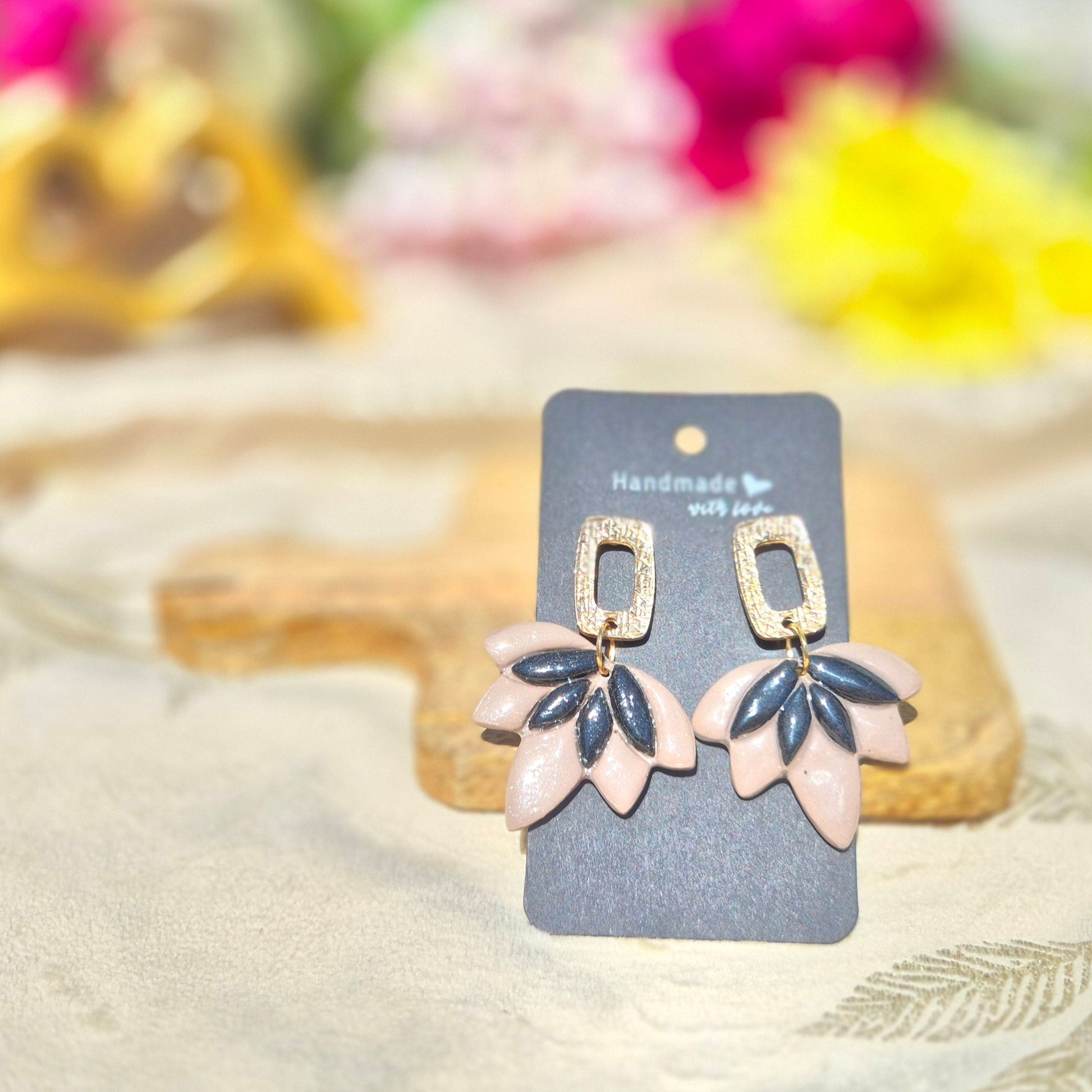 Cette paire incarne l’élégance naturelle, avec ses pétales beige sable et noir intense, relevés par un éclat feuille d’or à l’extrémité. Parfaite pour un look chic, bohème ou habillé, elle sublimera chaque mouvement.