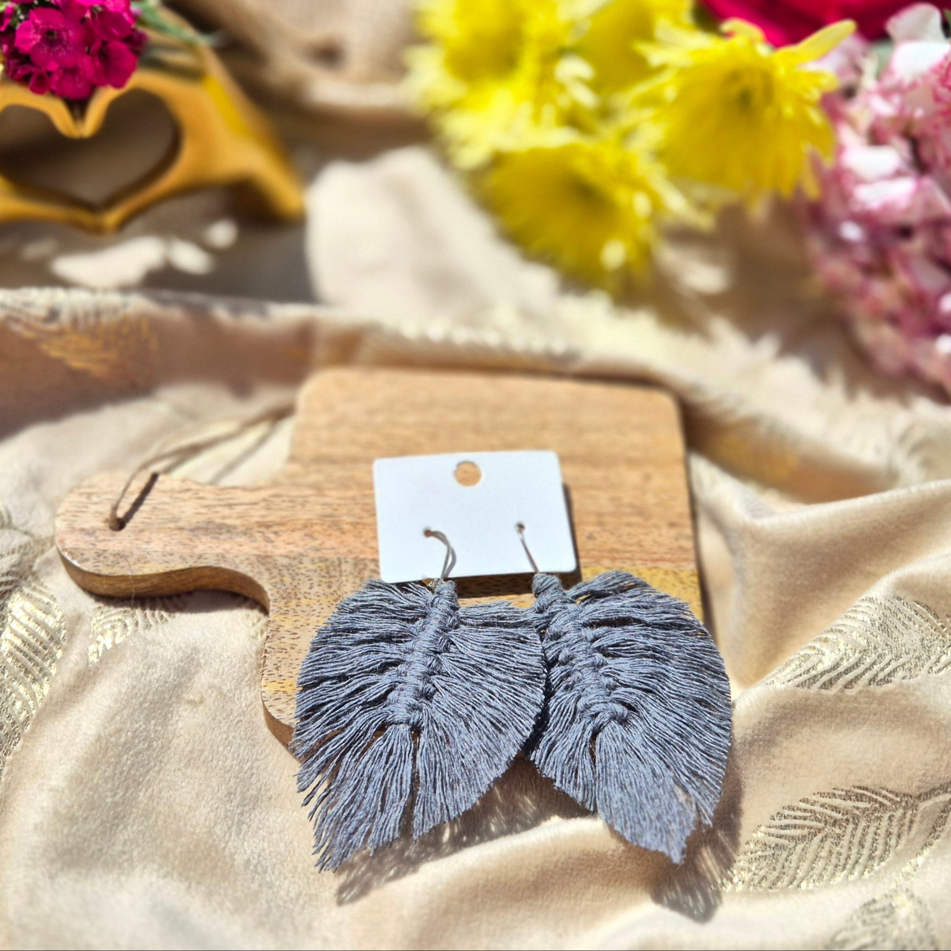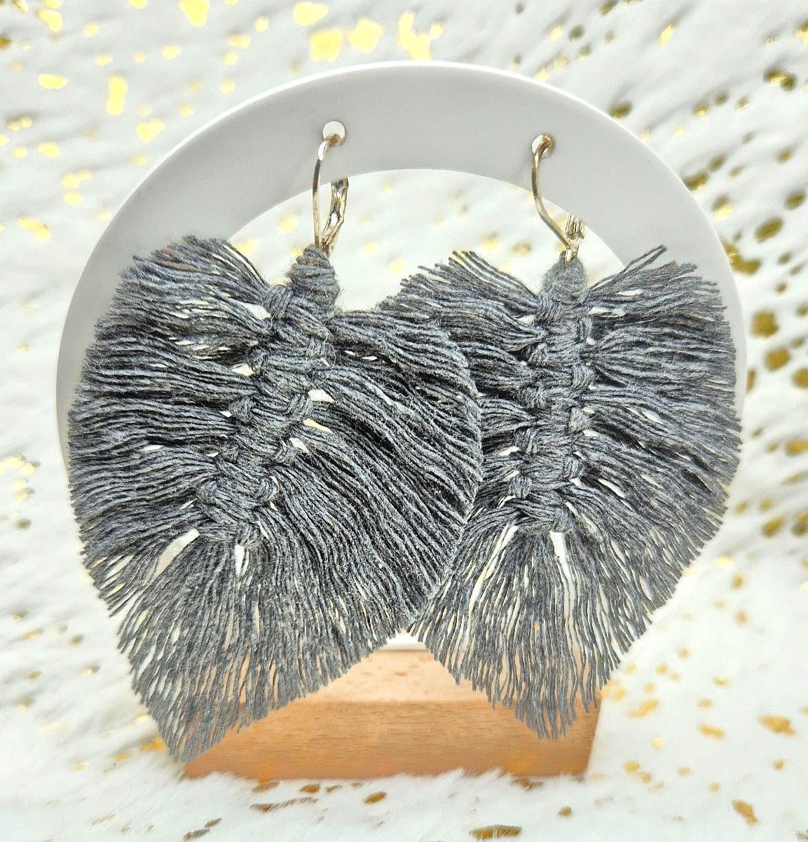 Boucles d’oreilles en macramé tissé à la main, dans un gris profond et texturé, parfait pour un look bohème minimaliste. Idéales à porter avec une tenue nude, monochrome ou casual chic.