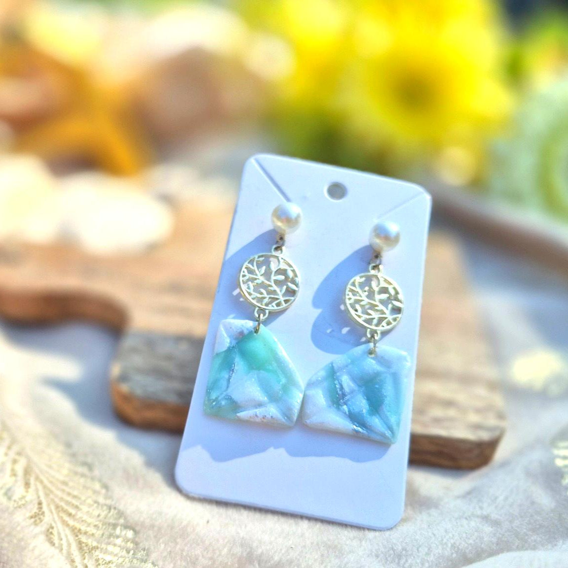 - Attaches et apprêts : perles nacrées, cercle feuillage argenté en acier inoxydable