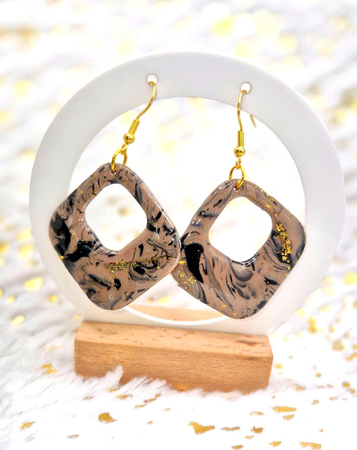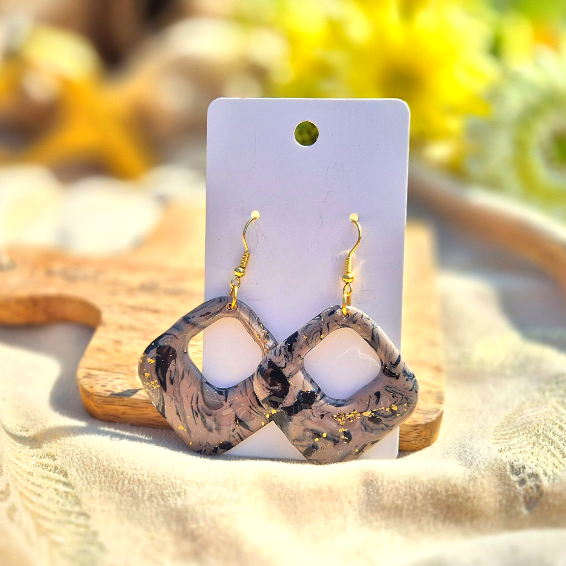 Une élégance minérale aux reflets dorés. Les boucles Kaolys marient des tons beige et noir marbrés à des éclats précieux, dans une forme carrée douce évidée. Un bijou à l’aura naturelle, idéal pour sublimer les looks bohèmes sophistiqués ou les tenues minimal chic.