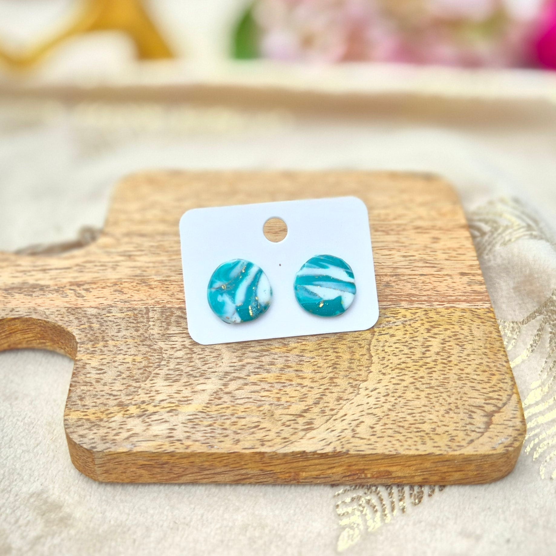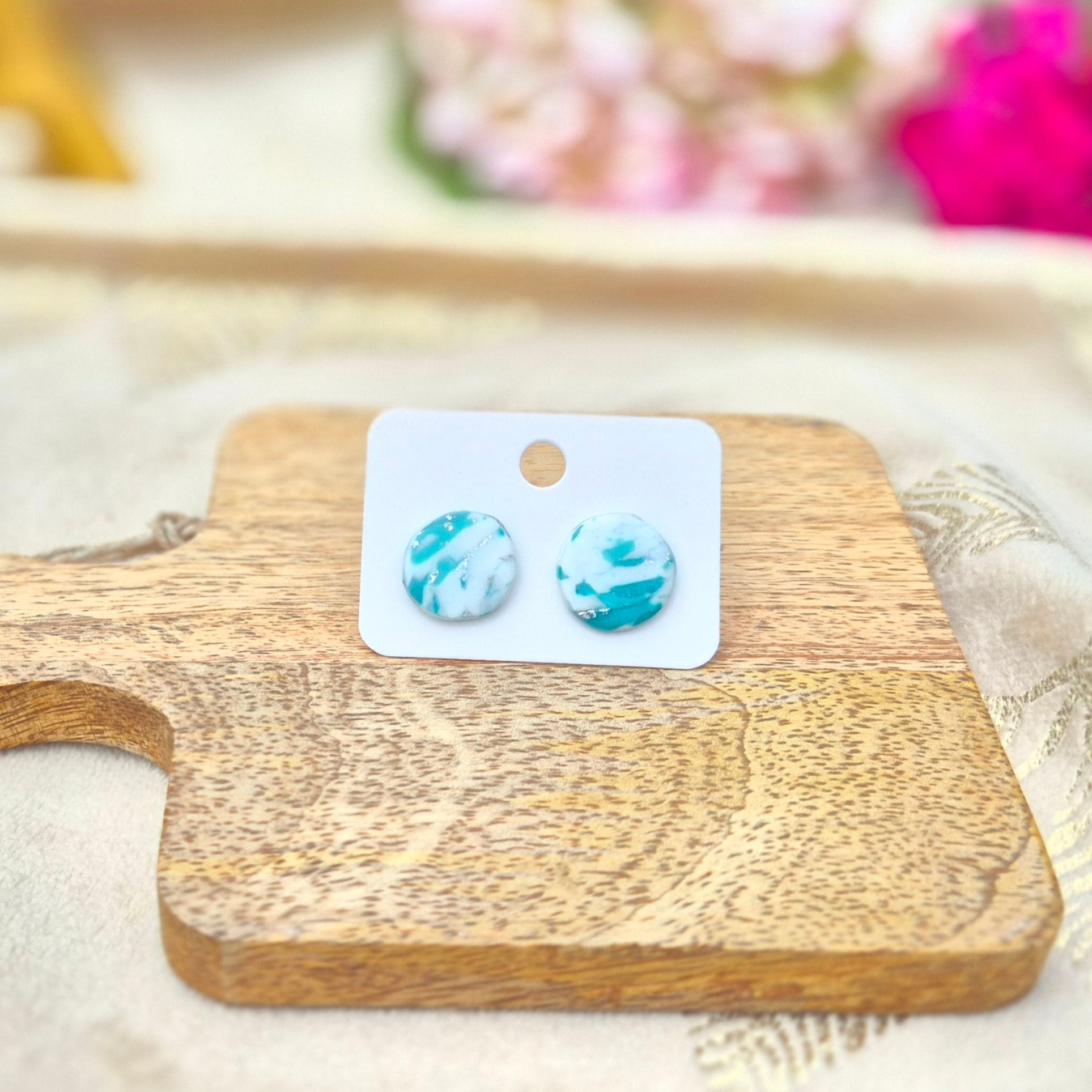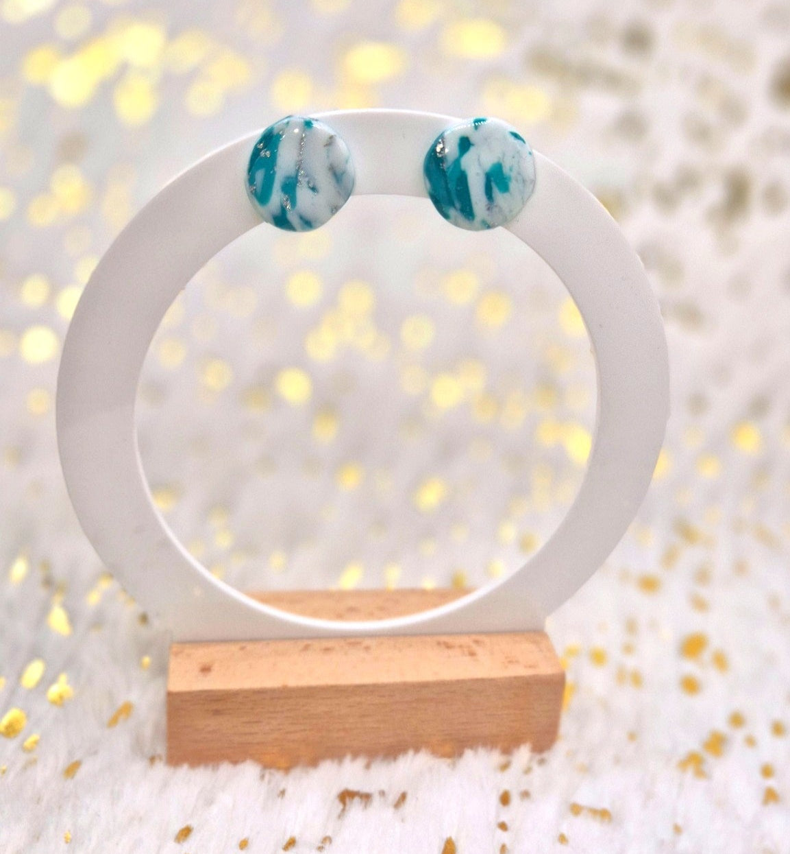 Une touche de fraîcheur et de mystère : ces puces d’oreilles arborent un marbré bleu lagon et des reflets argentés, parfaits pour un style chic et minimaliste.