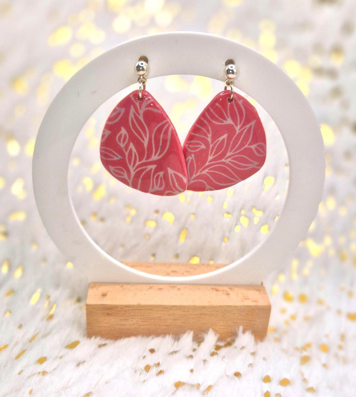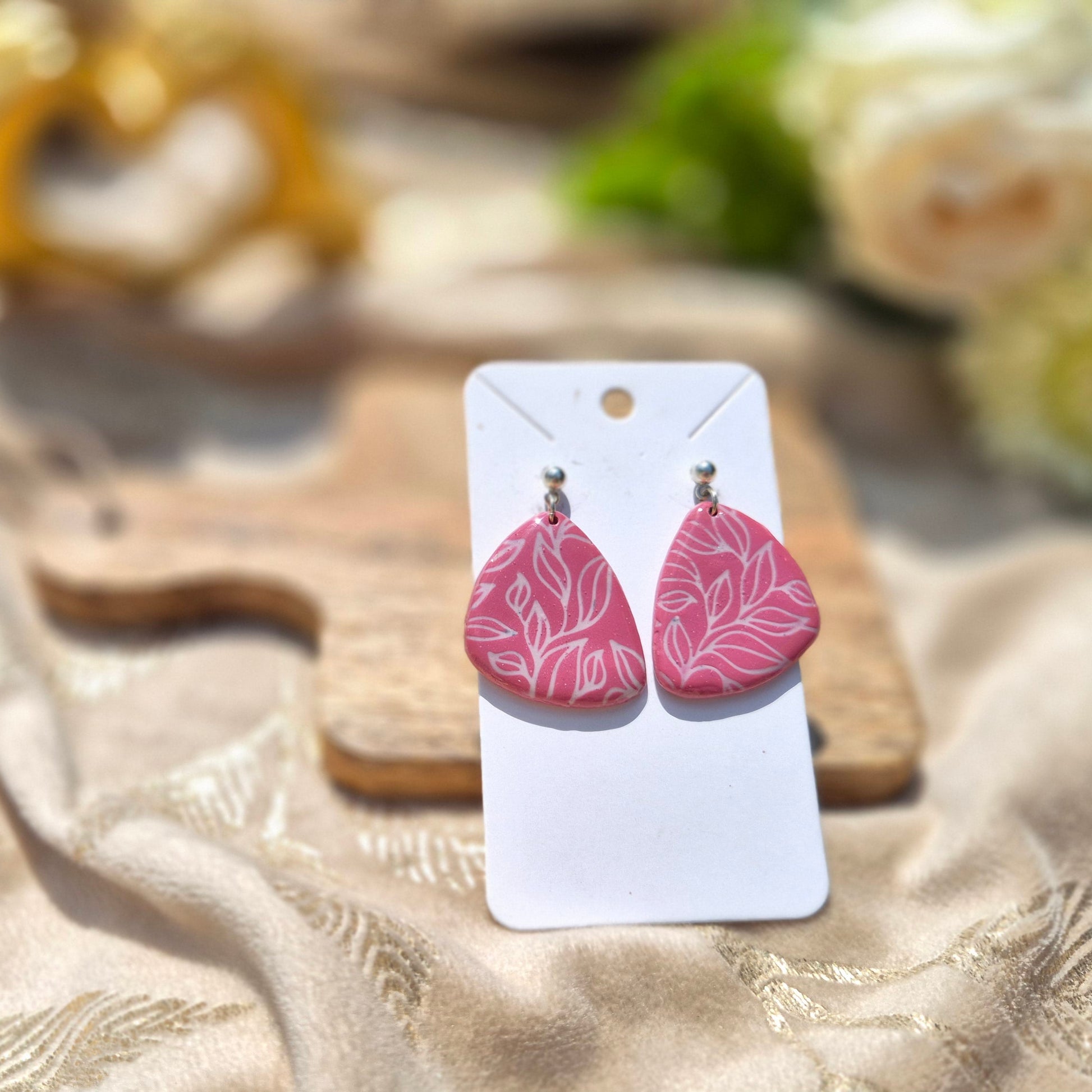 LeafLuxe marie un motif délicat de feuillages blanc sur un fond rose poudré, sublimé par la brillance de la résine. Une paire élégante et contemporaine, idéale pour apporter une touche naturelle et premium à vos looks.