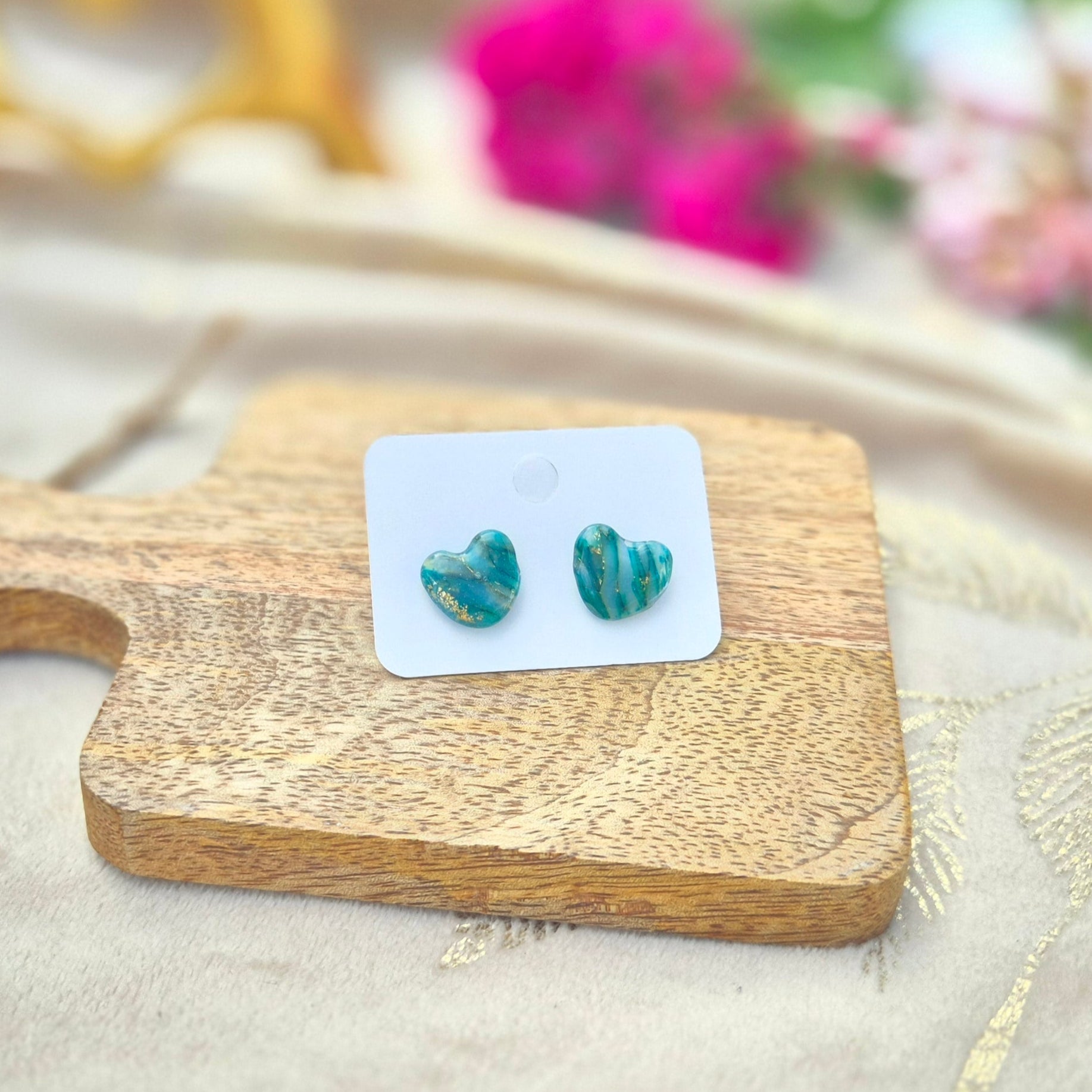 Minéa révèle de délicats clous en forme de cœur aux nuances vert émeraude subtilement chatoyantes et touches dorées, pour un bijou artisanal organique, chic et raffiné.