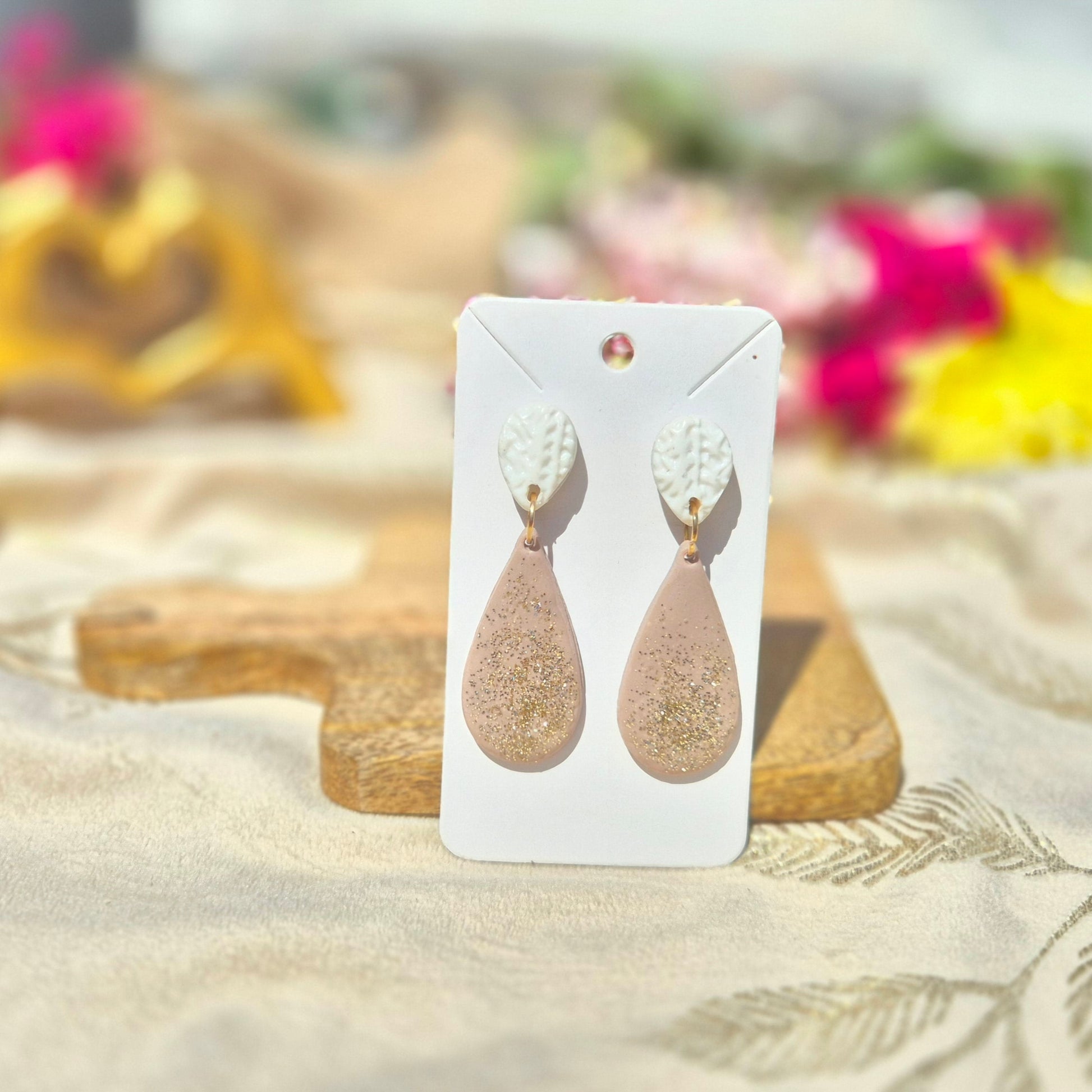 - Attaches et apprêts : puces blanches texturées en pâte polymère, acier inoxydable de couleur argentée