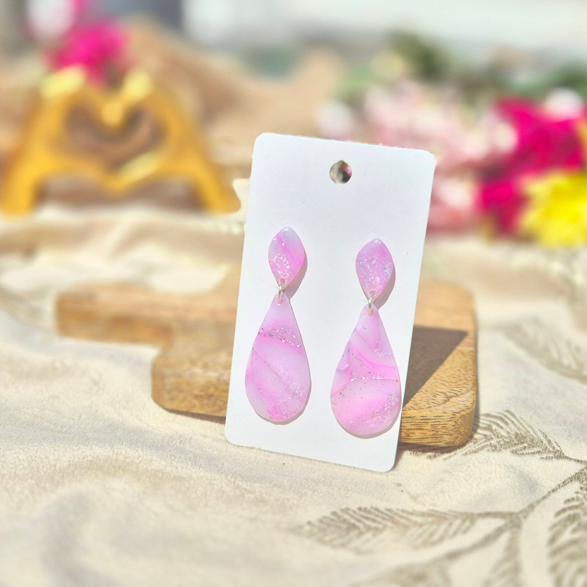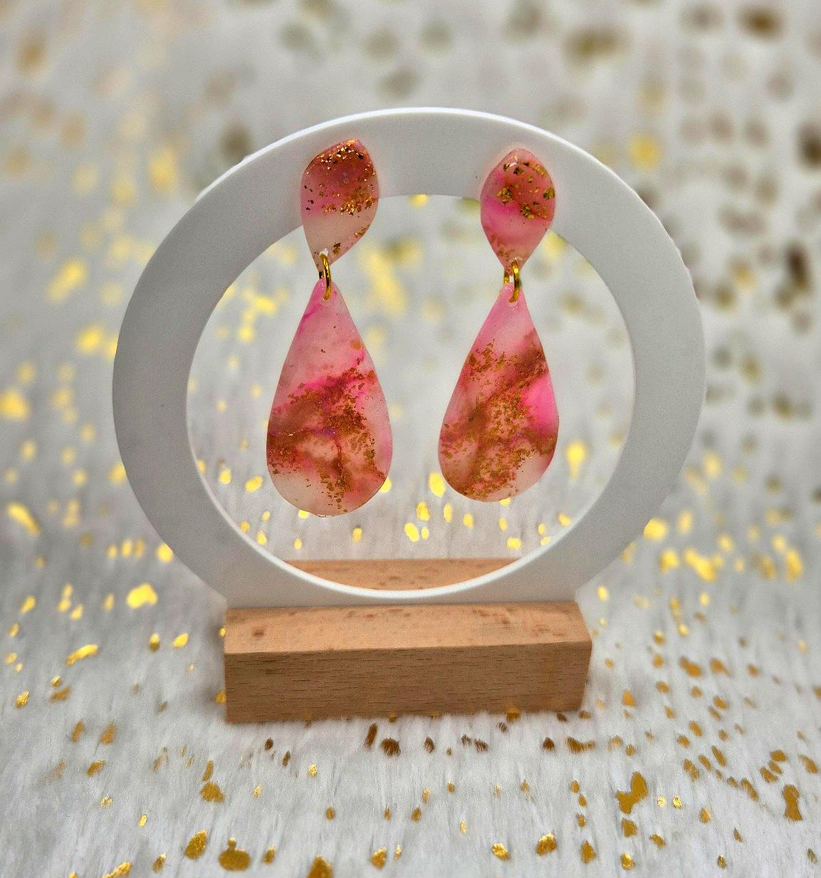 Ses nuances de rose marbré, subtilement irisées, rappellent la noblesse d’une pierre semi-précieuse. Avec leur forme en goutte et leurs reflets lumineux, ces boucles apportent une touche précieuse à un look romantique ou chic naturel.
