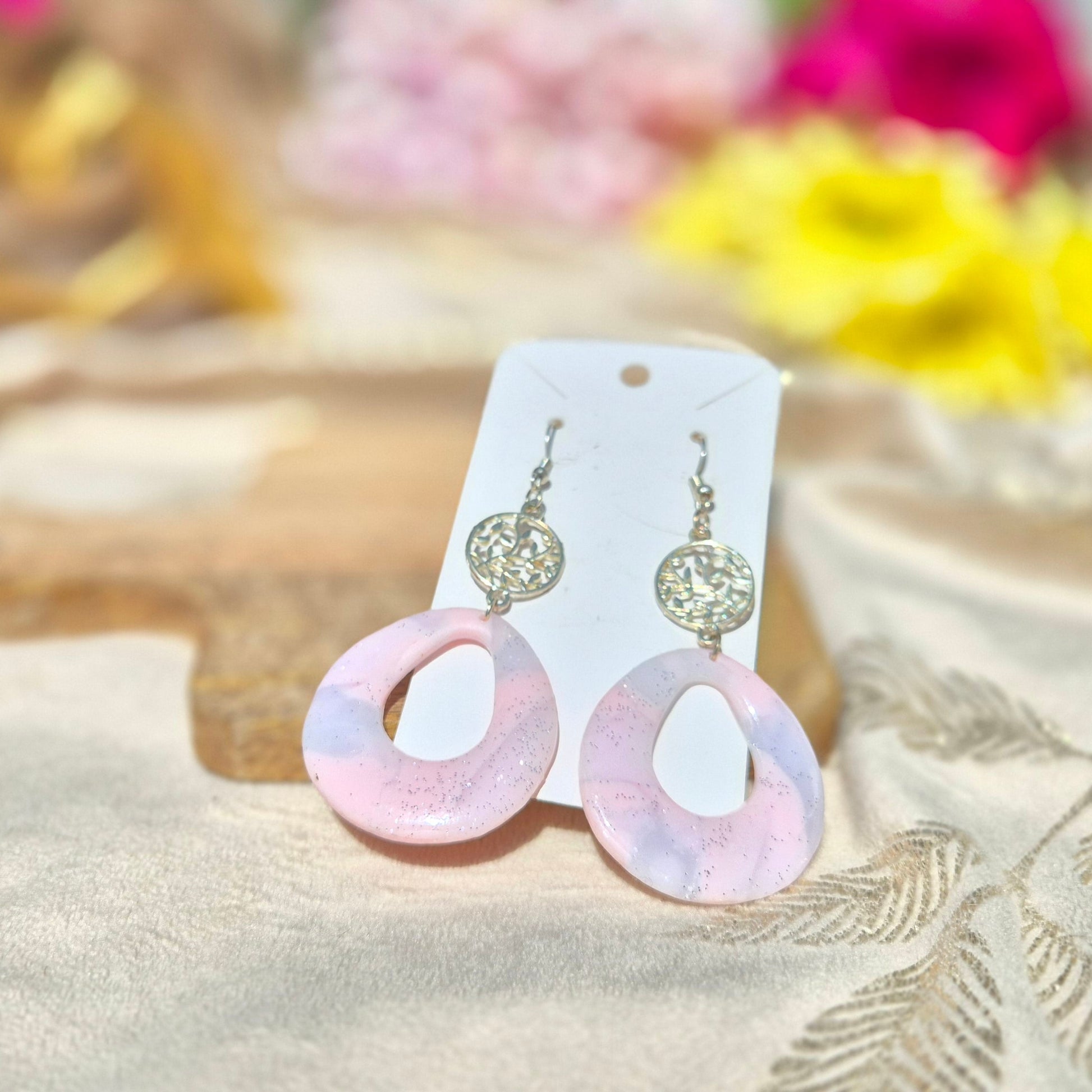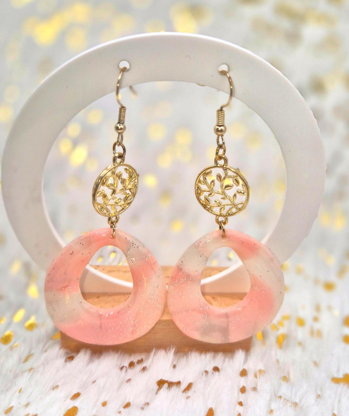 Rosaluxe associe une forme goutte marbrée rose poudré et paillettes argentées à un rond argenté, pour une touche chic, scintillante et résolument moderne.