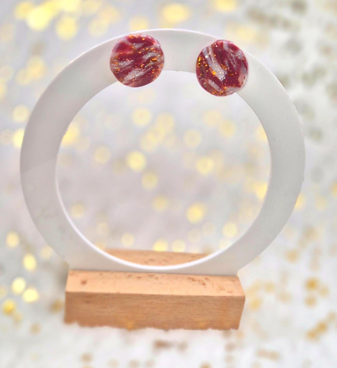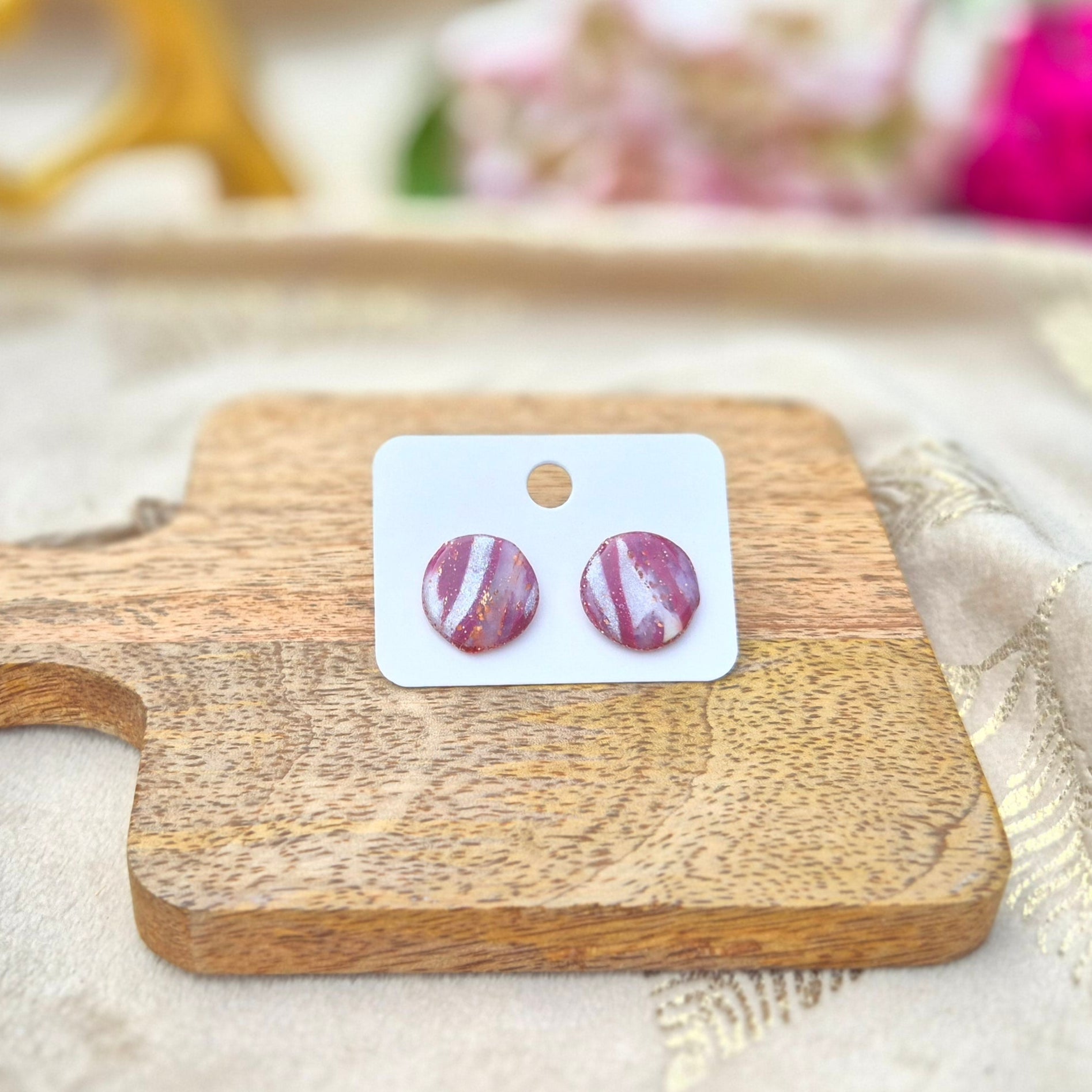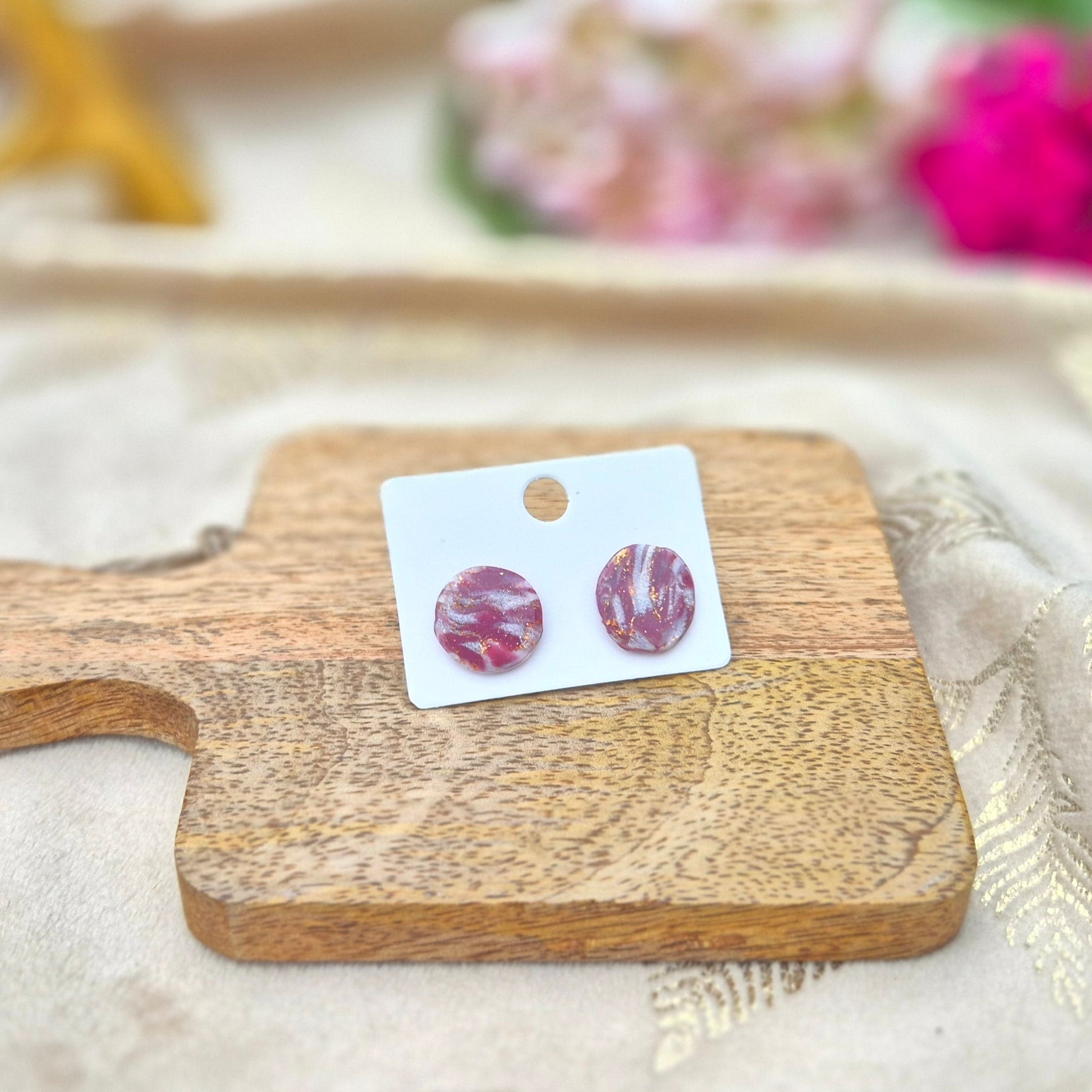 Ces boucles d’oreilles aux reflets rosés et paillettes dorées ajoutent une touche féminine et lumineuse à votre look. Leur forme ronde et leur texture marbrée capturent la lumière avec élégance, idéales pour un style doux et chic.