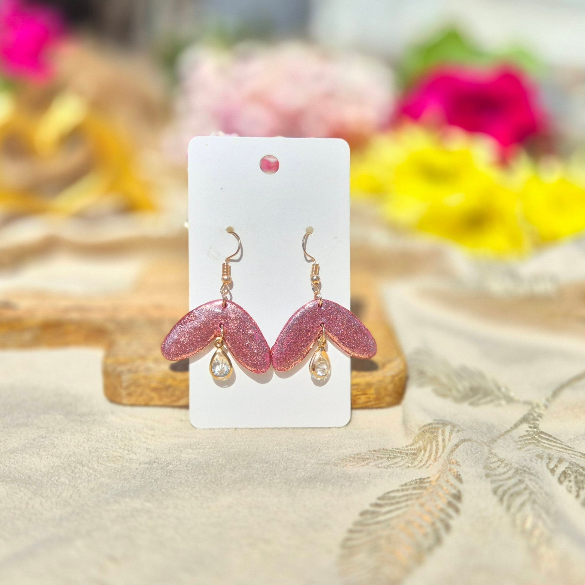 Fabriquées à la main en pâte polymère et finition rose pailletée, elles sont sublimées par une goutte de cristal clair suspendue, qui capte la lumière avec élégance.
