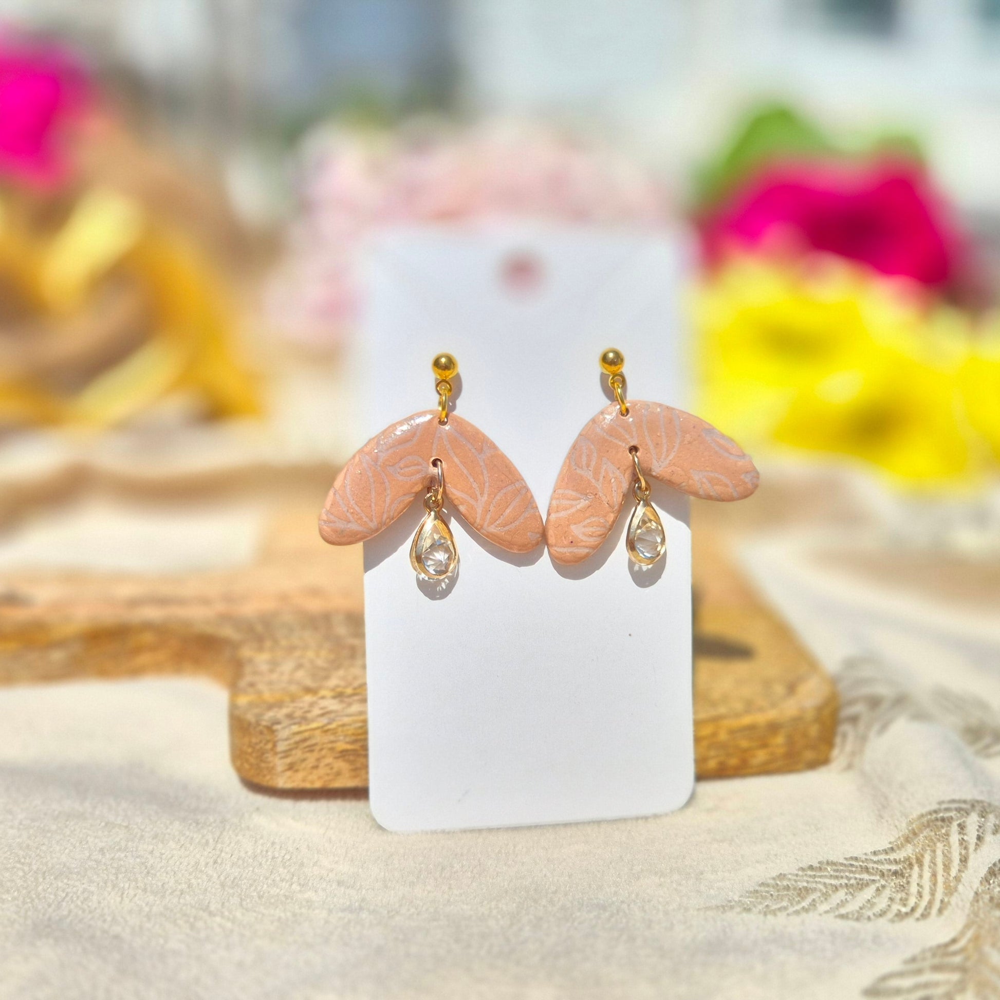 Elles marient un beige sableux à des motifs feuillus subtils, gravés à la main. Leur éclat discret est rehaussé par une goutte de cristal lumineuse, comme une larme née de la lumière du matin.