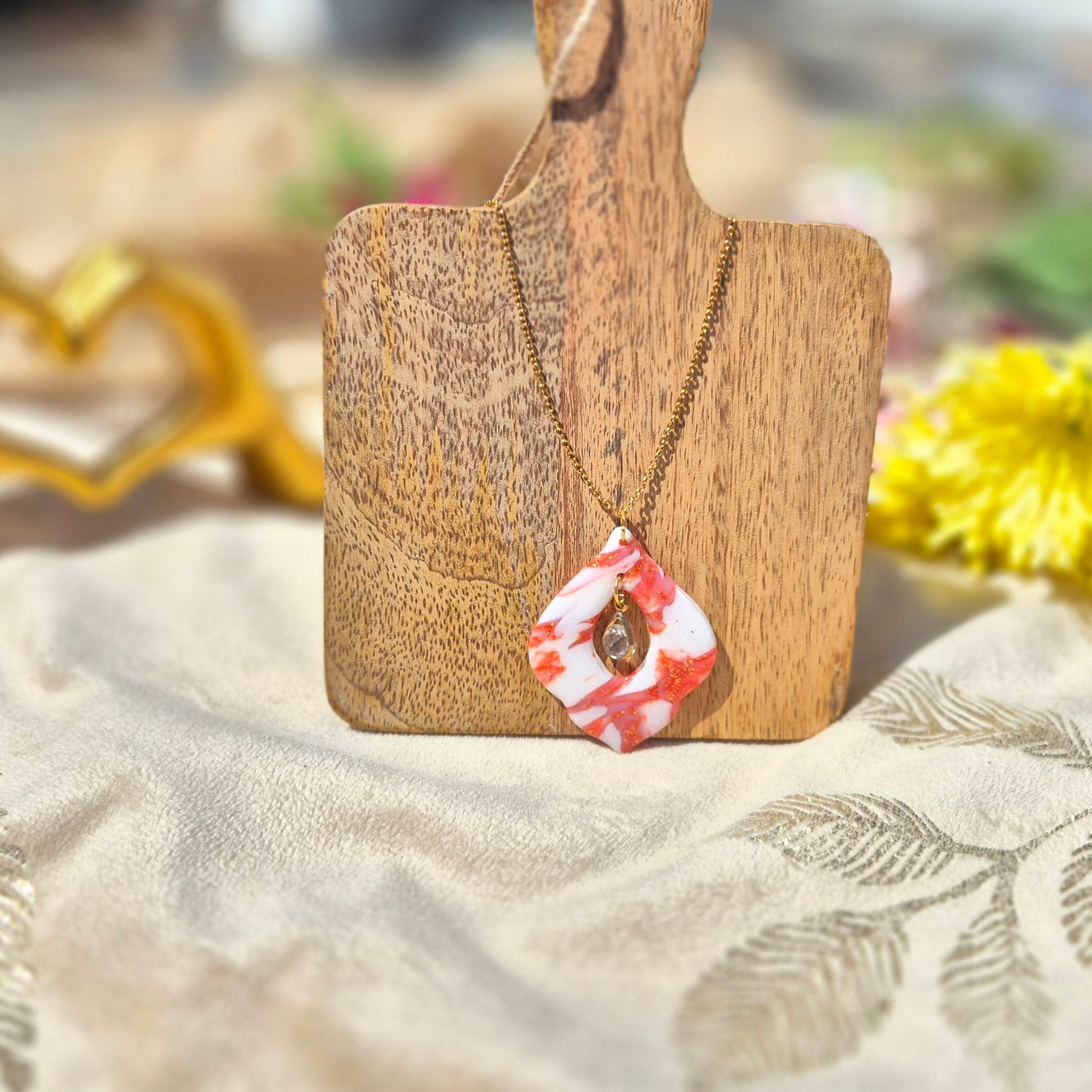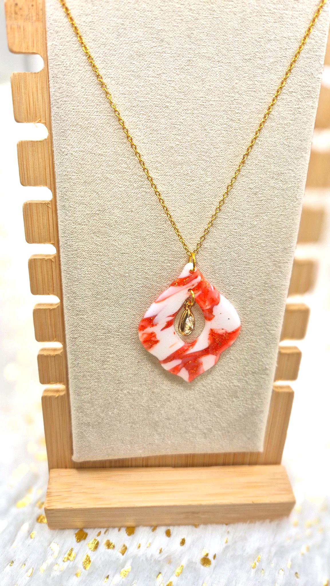 Son pendentif marbré corail, blanc et or, rehaussé d’une goutte cristalline, attire les regards et sublime votre style.