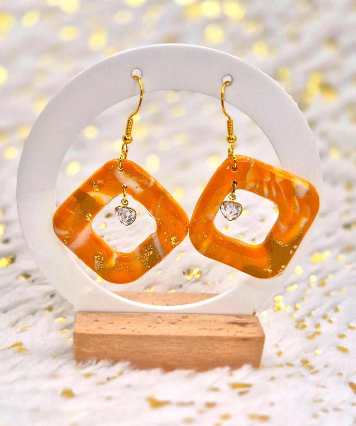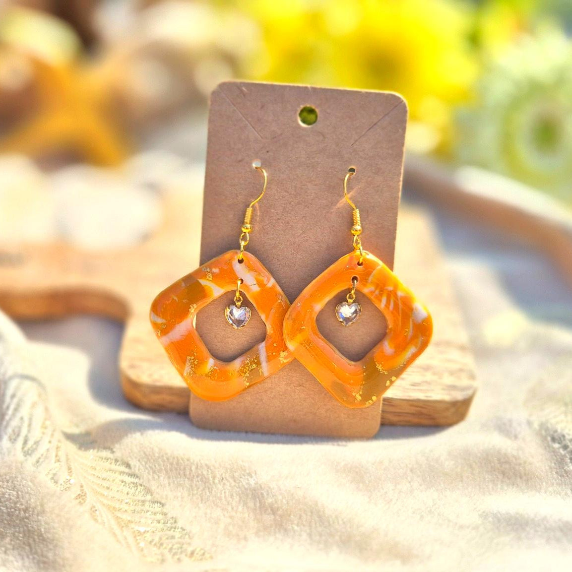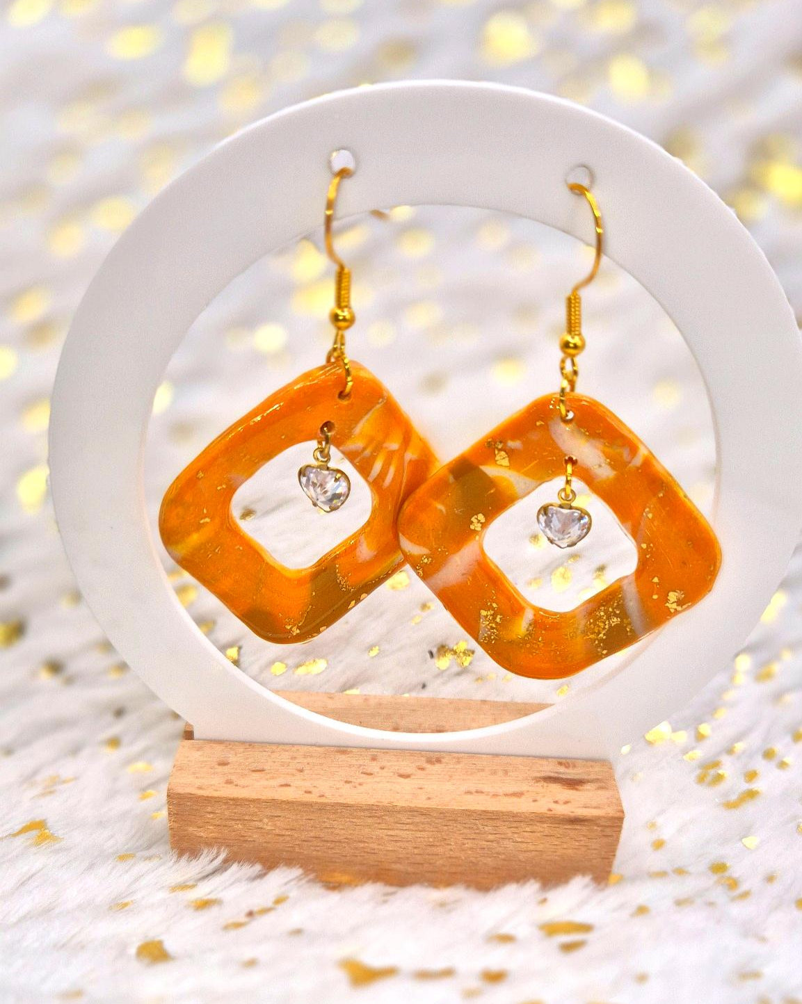 Une chaleur dorée capturée dans une forme aérienne. Les boucles Solstys marient un marbré ambre lumineux, des éclats dorés et un cœur cristallin suspendu. Un bijou solaire qui sublime aussi bien les looks bohèmes, estivaux que les tenues minimal chic.