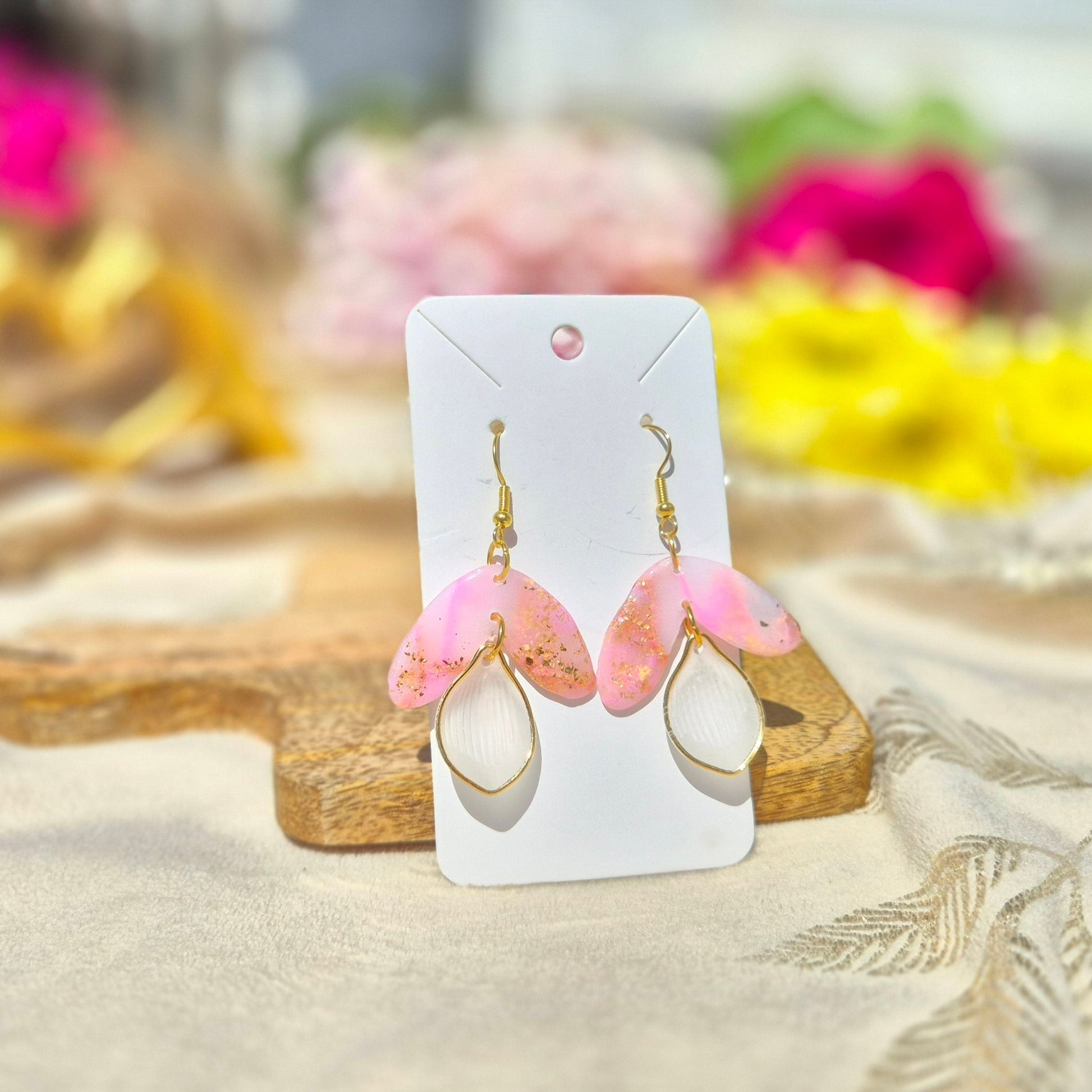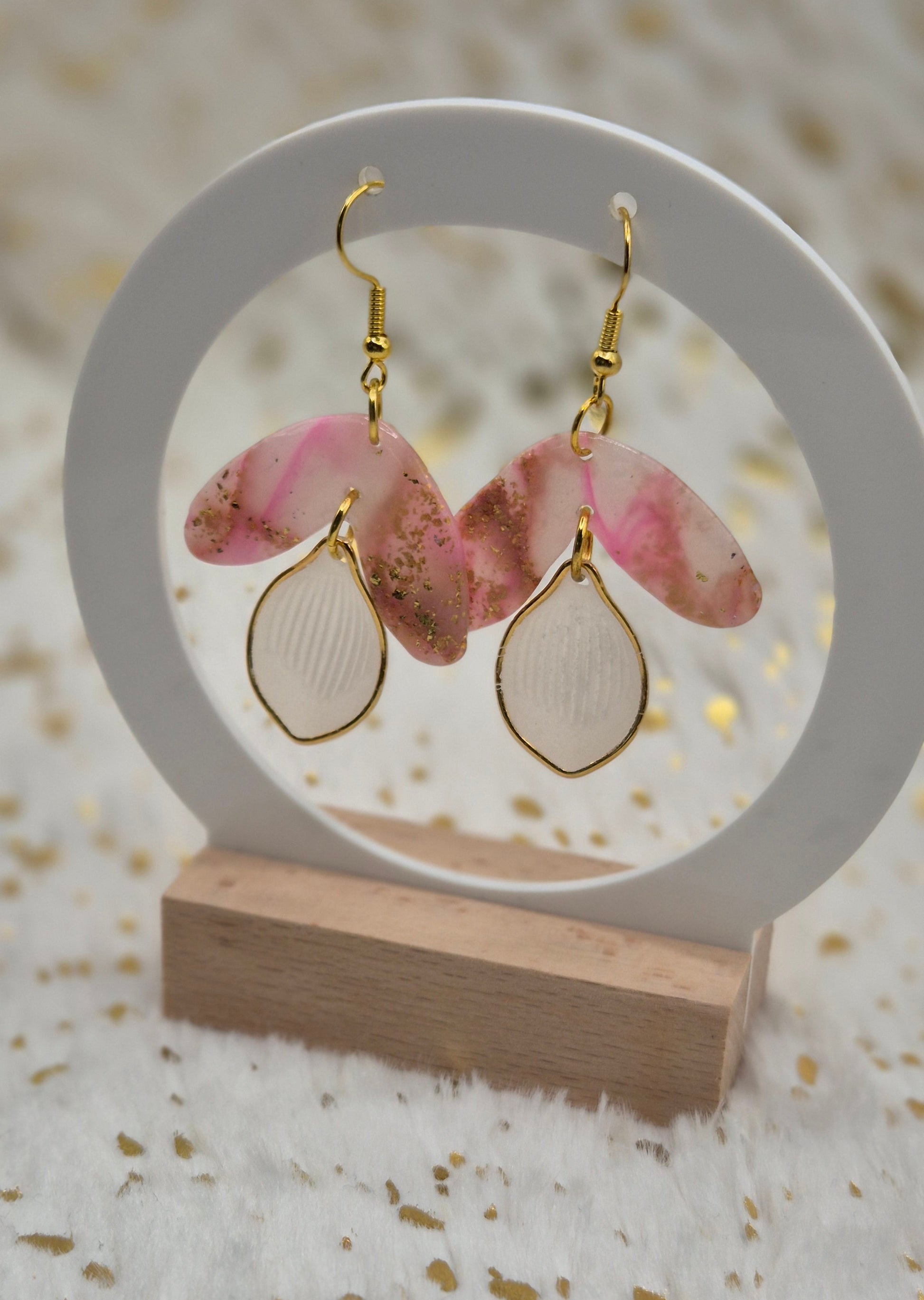 Inspirées par les pétales de cerisier caressés par la lumière de la lune, ces boucles mêlent des éléments en pâte polymère rose marbré, translucides avec des touches dorées scintillantes, surmontées de breloques nacrées et finement cerclées d'or.