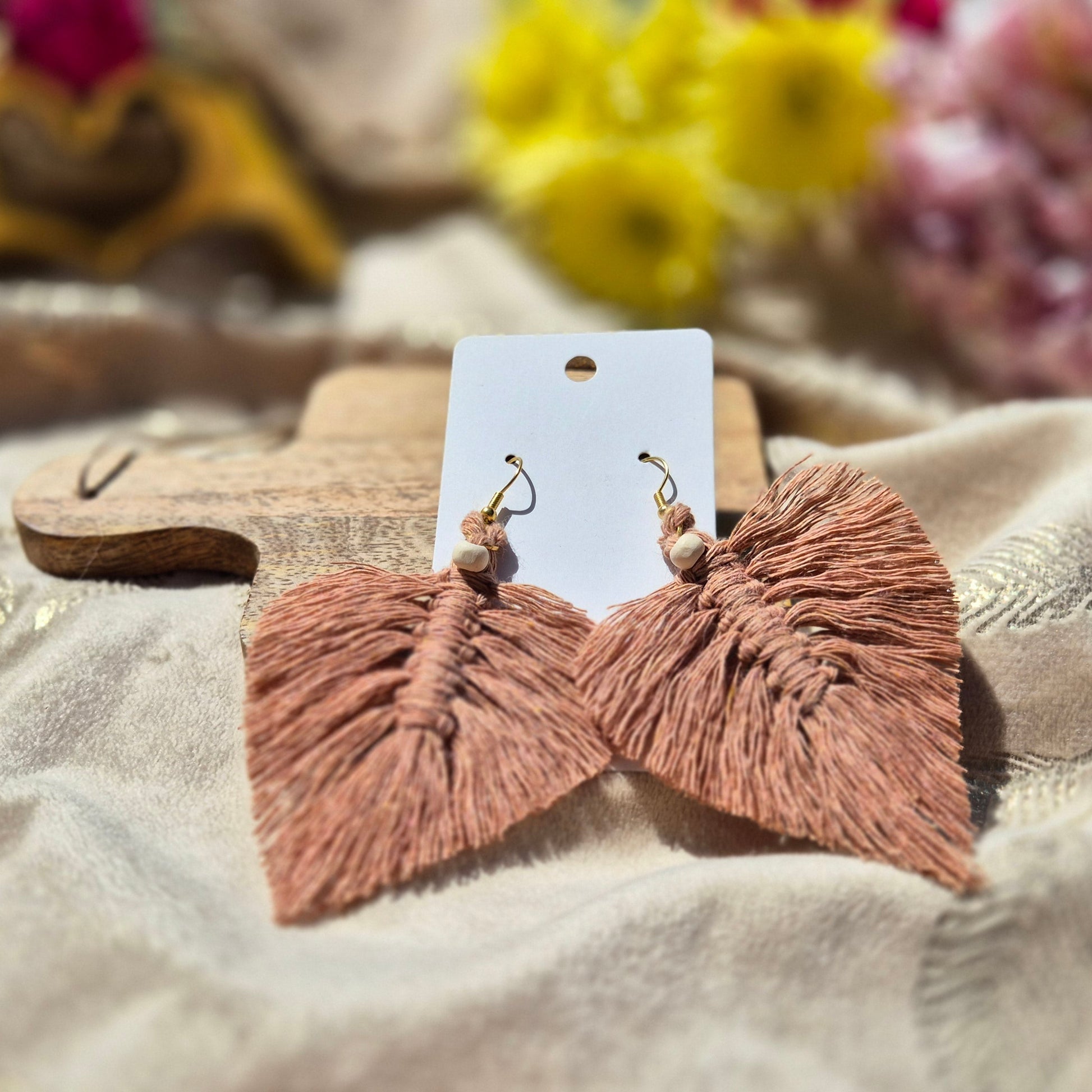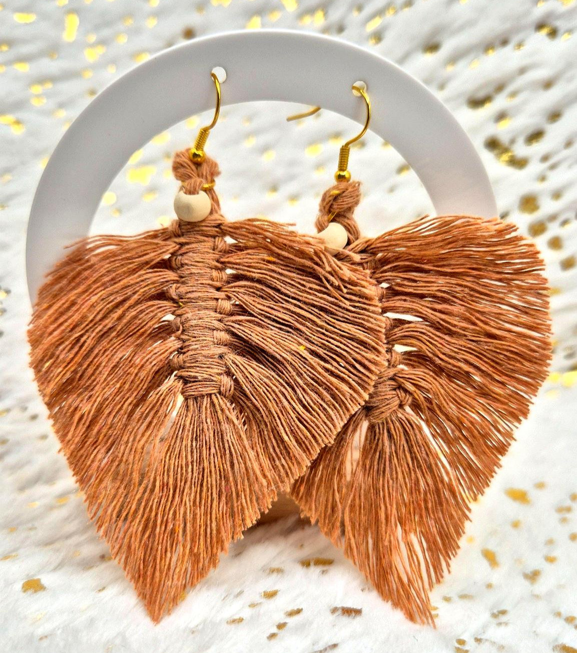 Une paire de boucles en macramé aux reflets terre de sienne, parfaite pour un look bohème-chic et naturel.