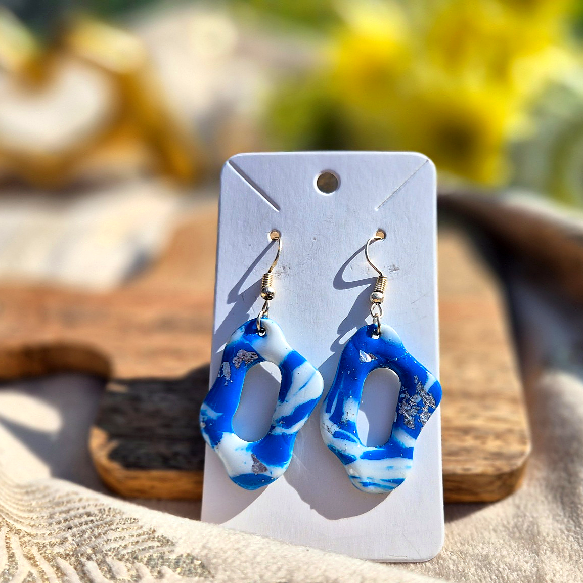 Une vague libre sculptée dans un bleu vibrant. Les boucles Vague d’Indigo mêlent marbrures océan et éclats argentés dans une forme organique et contemporaine.
